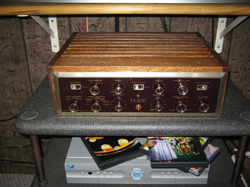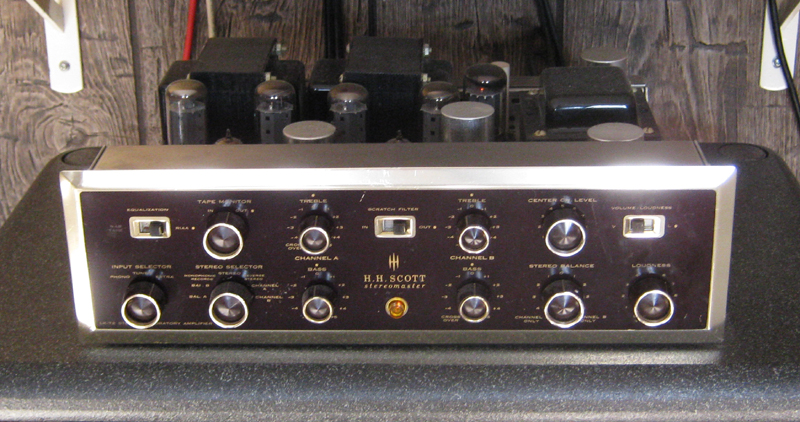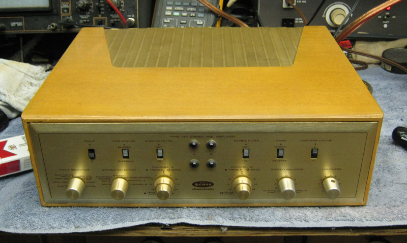 HH Scott 130 Preamplifier *SOLD* This 130 Preamp is from my own personal audio collection. I have used it on and off for the last 3 or 4 years. This preamp worked perfectly when I acquired it on trade. But I still replaced the failure prone Selenium rectifier correcting the voltages for the new SS bridge rectifier. I also replaced all under chassis coupling caps and small axial lead electrolytic caps for Sonic reasons. This preamp will come with minty all original tube set of Telefunken 12AX7's and 12AU7's along with a HH Scott branded rectifier tube. As the pictures below will show almost all the white stencil print is still in great shape on all these tubes. The tubes alone are worth $375 separately but I would rather keep this piece of Audio history with its original tube set intact. The face plate is as close to 10/10 near perfect as I have ever seen. The wood case I would say is 8/10 with some small nicks and scratches as is the chassis with some mild discoloration. This preamp comes with a full one year repair warranty if it breaks and can not be diagnosed and repaired via email or phone then I will fix it for free. You just cover shipping costs. $1150 w/ wood cabinet plus actual shipping cost After X-mas sale price $1050 *SOLD* Deduct $100 without wood cabinet